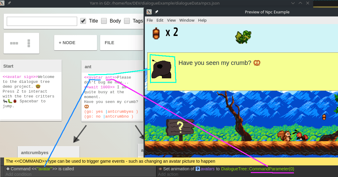 Apart of the commands you can set up for yourself, and the ones built into the extension, yarn's parser library - bondagejs comes with a few very cool built in ones that can be used to store information and use it to conditionally show text to the user. So lets say your player visits a dialogue branch of an item once and has read it. Then having that information, the player starts a conversation with a npc.
