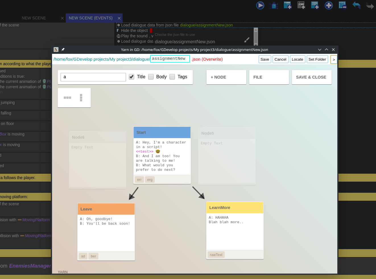 • I encountered a problem while using Yarn to edit my dialogue - If that happens, unless you have encountered the problem when opening or saving your dialogue - it's likely a bug in Yarn, not Gdevelop.