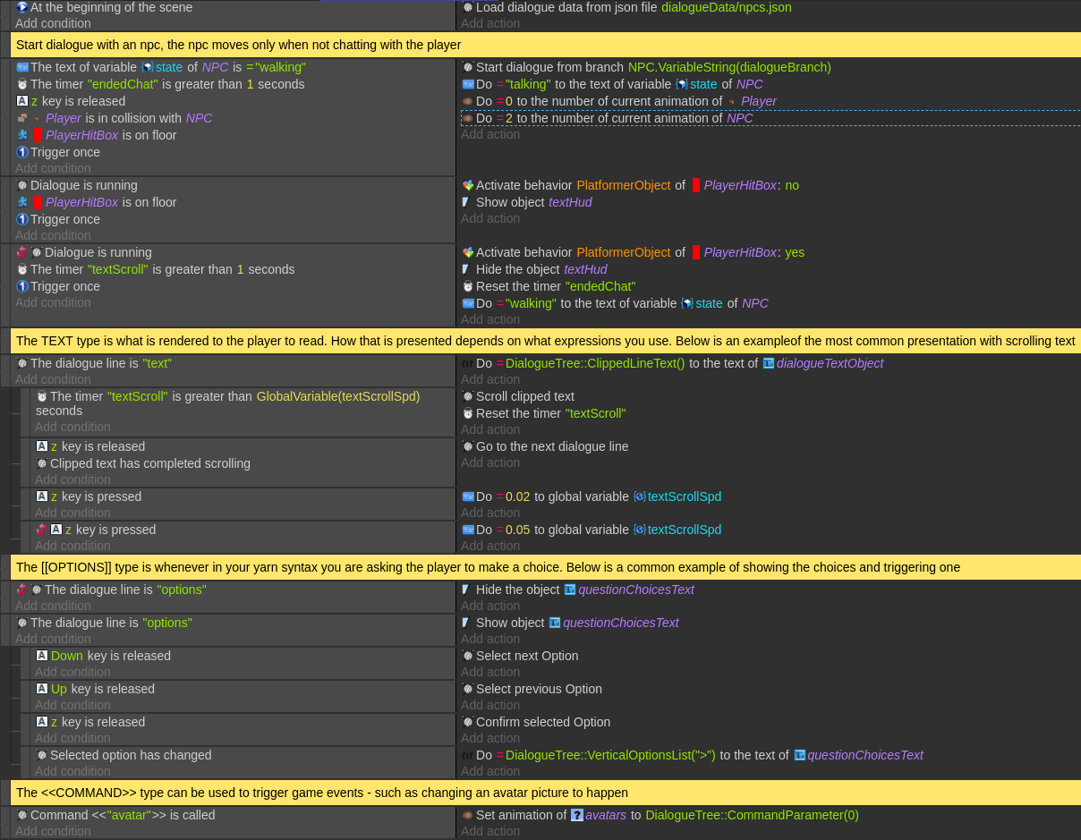 The best thing to do to get started really is to open the demo project for the dialogue tree extension. From there on you can build your own functionality on top or even your own extensions. If you look at the event sheet, you will find that the entire logic fits on a single screenshot