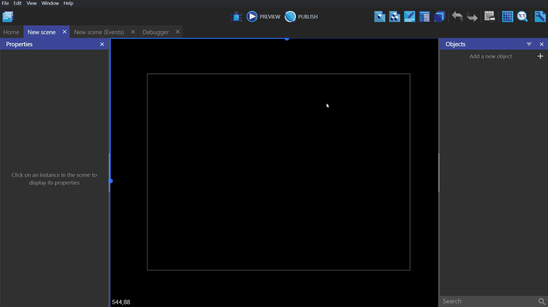 Add a scene by pressing on the highlighted button in the image below. Right click on that scene to rename it. Then left click on the scene to open it.