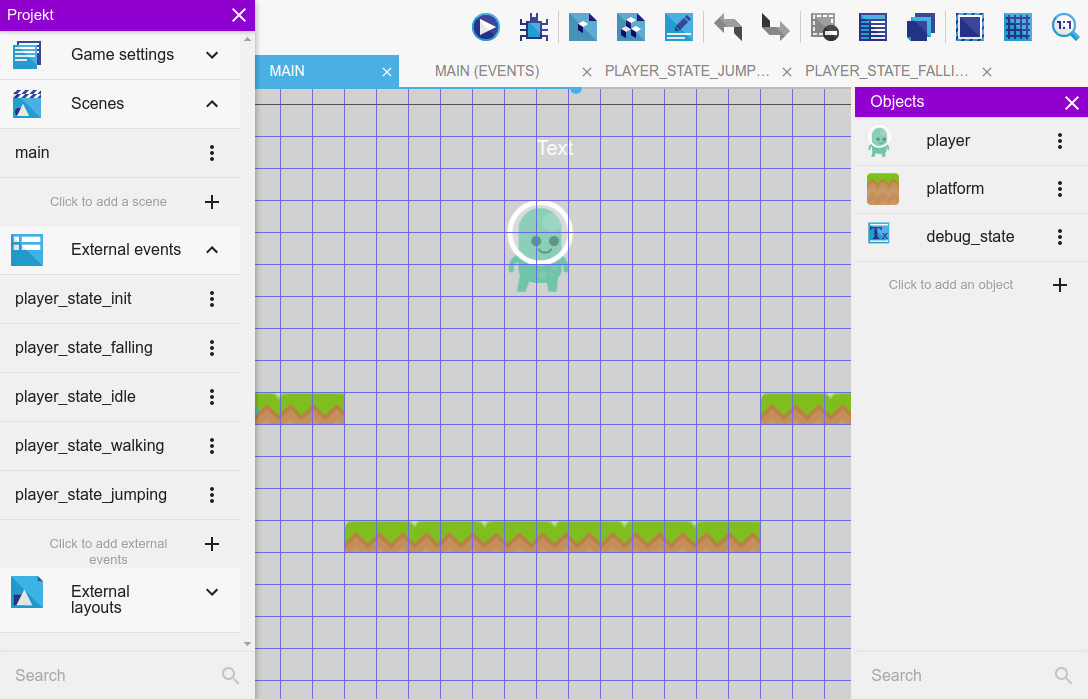 Switch to the event editor (“main” scene) and create these external events “playerstateinit”, “playerstatefalling”, “playerstateidle”, “playerstatewalking”, “playerstatejumping”. In the events of your main scene create a new event group from the drop-down menu on the right-hand side. Name it “Player logic”. Now add a "At the beginning of the scene" condition. Add a sub-event to the condition and link in the external event sheet “playerstateinit” via the “add”/”other” button. Do the same for all the other player states.